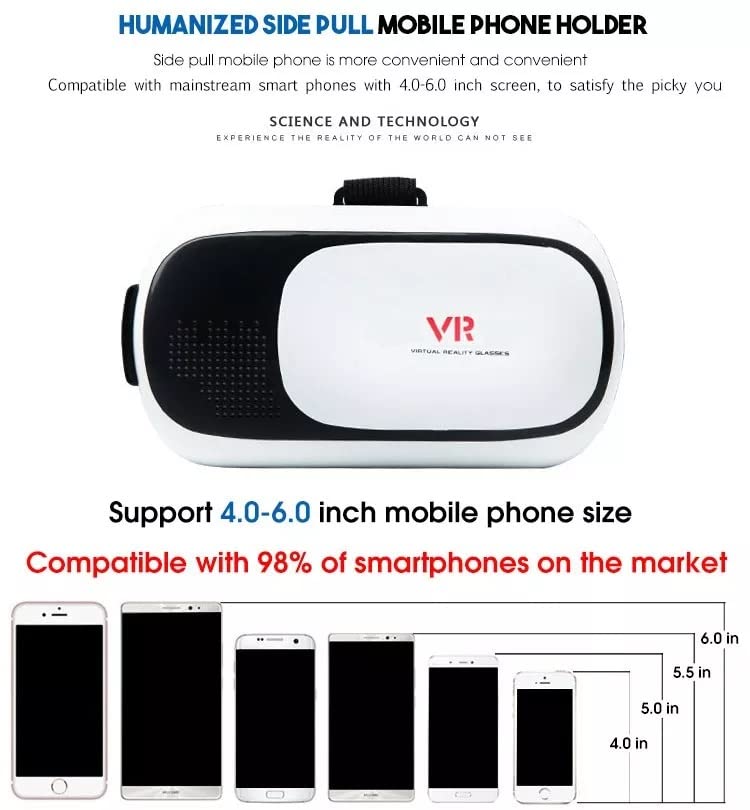 Details: Silicone Eye Mask Design: Compared with other VIRTUAL REALITY BOX glasses with sponge eye mask, the silicone gel is more comfortable, non-absorbent and hygienic -} VIRTUAL REALITY ERGONOMIC DESIGN: Our Virtual Reality glasses with ergonomic T-shaped straps reduce some pressure around your eyes, face and head, when you using this Virtual Reality glasses without dizziness and fatigue.also the straps can be adjustable and fit for different sizes of heads. -} ADJUSTABLE DESIGN: You can adjust the position of the resin spherical lens slightly by rolling the gear on the top of the 3D VIRTUAL REALITY BOX -} WIDE COMPATIBILITY: It supports smartphones with 4.7-6.53 inches screen, such as Phone X 8 7 plus/6s, Samsung s8/s8 Plus/s7/Huawei Mate 9 Pro, etc, If you are not sure your phone whether can fit this Virtual Reality , you can contact with us.It is good partner to travel along or Home. Good Gift for the kids -} Virtual Reality Apps: There are over 300 virtual reality apps available for download and you can enjoy the amazing 3D effect! (Note: to get a clear and correct view, you need to select “Split Screen Mode” in the 3D VIRTUAL REALITY