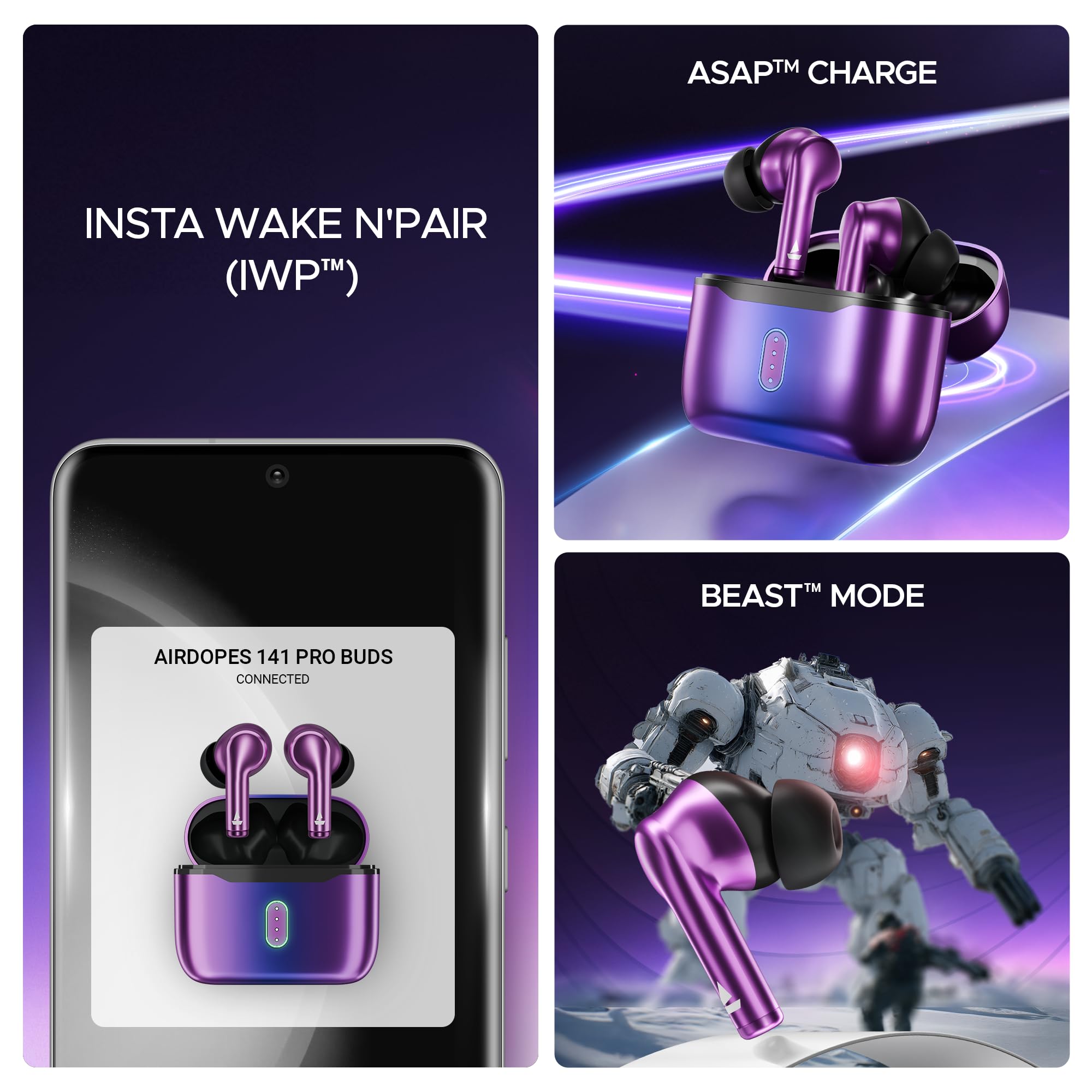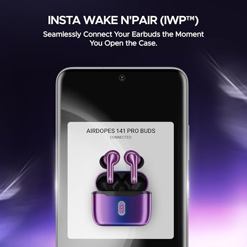 Boat Airdopes 141 Pro Buds, 13mm Drivers, Metallic Finish, 60HRS Battery, 4Mics ENx, Fast Charge, IPX5, v5.3 Bluetooth Earbuds, TWS Ear Buds Wireless Earphones with mic (Galactic Purple)