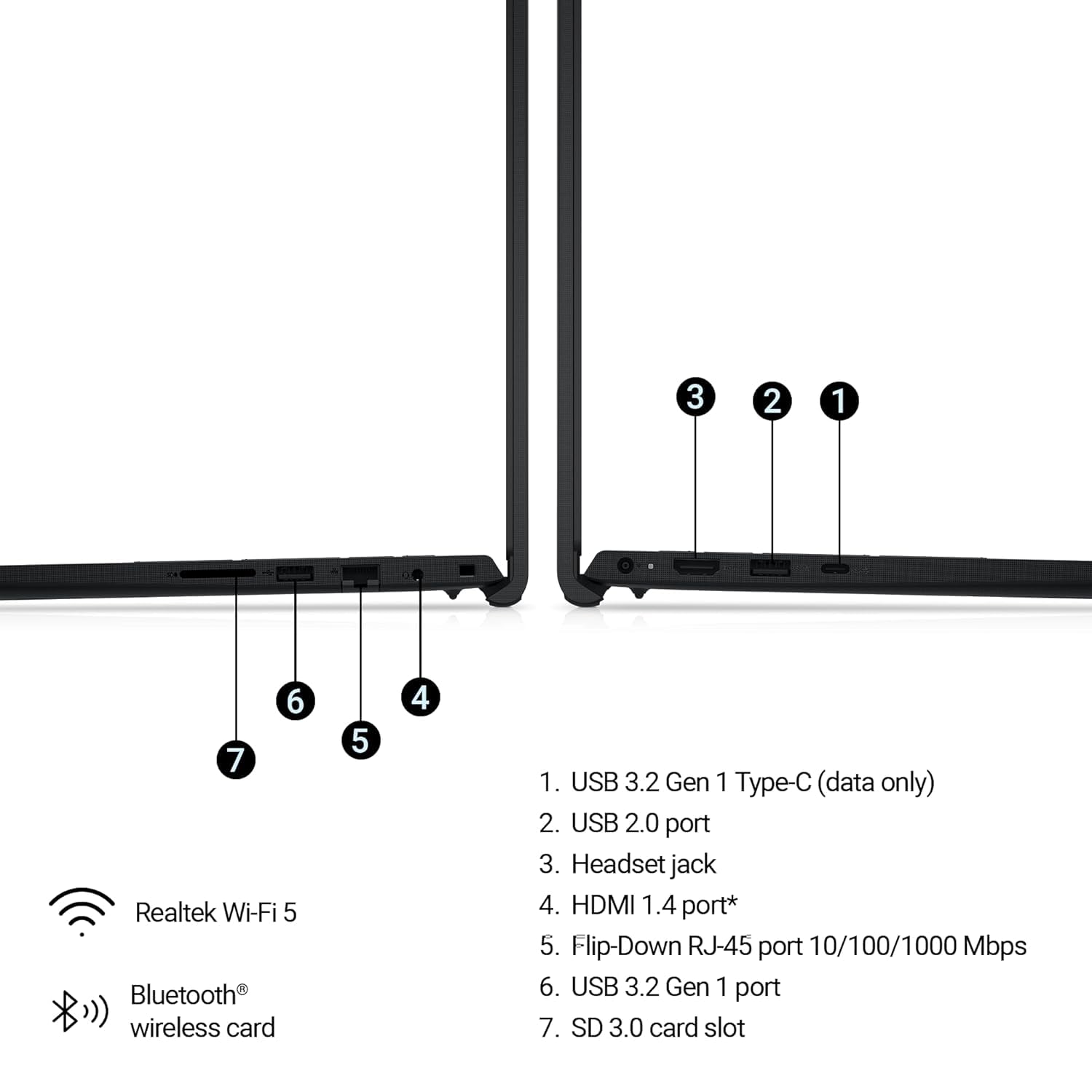 - Ports: 1 USB 2.0 port, 1 Headset jack, 1 HDMI 1.4 port*, 1 Flip-Down RJ-45 port 10/100/1000 Mbps, 1 SD 3.0 card slot, 1 USB 3.2 Gen 1 port, USB 3.2 Gen 1 Type-C (data only)