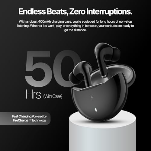Fire-Boltt Aero TWS Earbuds Custom EQ, Wireless Bluetooth 5.4, Music & App Support, 50H Playtime, Fast Charging Case, 50ms Low Latency for Gaming, Touch Controls, IPX4 Waterproof, Clear Calls – Black