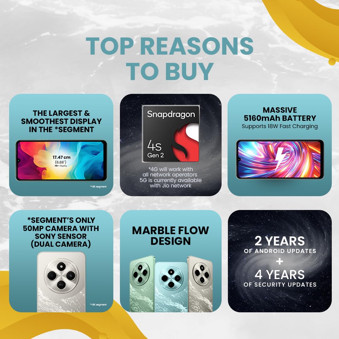 Details: Biggest Display 6.88″ HD+ 120Hz display | Snapdragon 4s Gen 2 5G processor* (Support SA 5G Network) | 8GB of RAM including 4GB virtual |50MP SONY Dual camera |Side fingerprint | 5160mAh Battery